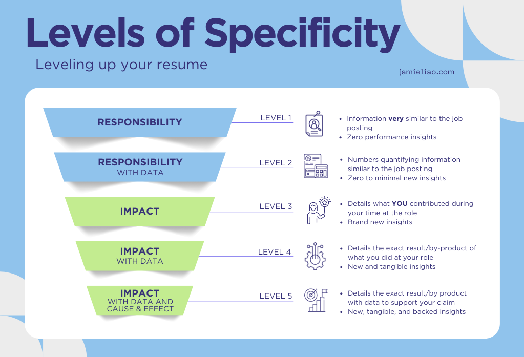 The “Levels of Specificity” framework is a tool students can use to assess and quantify the current strength of your bullet point. This framework is broken into 5 different levels with each step acting as a higher level from the previous, similar to a funnel.